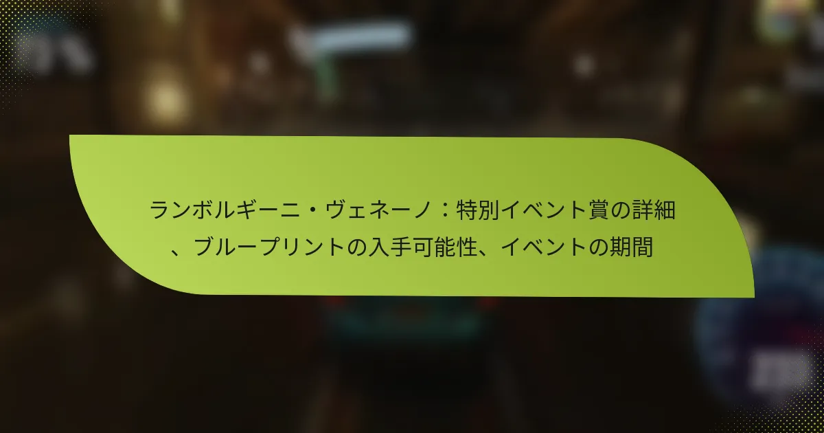 ランボルギーニ・ヴェネーノの特別イベント賞品には、プレイヤーが特定のチャレンジに参加することで獲得できる独占的なゲーム内報酬が含まれています。これらの賞品は、ゲーム体験を向上させ、プレイヤーにユニークな車両やアイテムを提供することを目的としています。